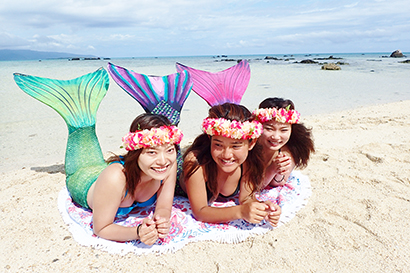 プレミアムマーメイド体験CM撮影などで使われた砂浜の島、幻の島(浜島)で憧れのマーメイドになれる。 花冠、サンゴフレームなど撮影に必要なアイテムも充実しているので、手ぶらでご参加可能。友達と一緒に、ツアーの日は特別にマーメイドになりませんか? マーメイドスーツは10種類以上あります。